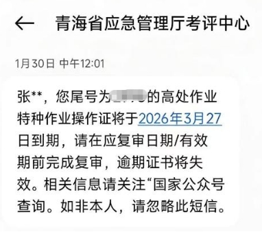 例如,1 月 30 日,持证人员张 * 收到省应急管理厅考评中心发送的数字化短信提醒,告知其尾号对应的高处作业特种作业操作证将于 2026 年 3 月 27 日到期,提醒其在复审日期前完成相关手续,避免证书失效。此类数字赋能下的精准提醒得到群众广泛好评,不少企业和持证人员反馈,短信提醒及时贴心,有效解决了以往 “记不住、分不清、找不到” 的办事难题。