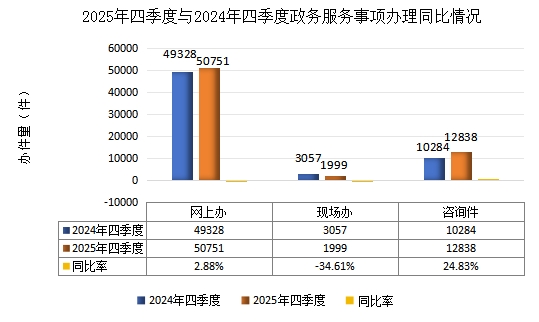 2025年第四季度比2024年第四季度网上办增加1423件,同比增加2.88%;现场办减少1058件,同比减少34.61%;咨询件增加2554件,同比增加24.83%。